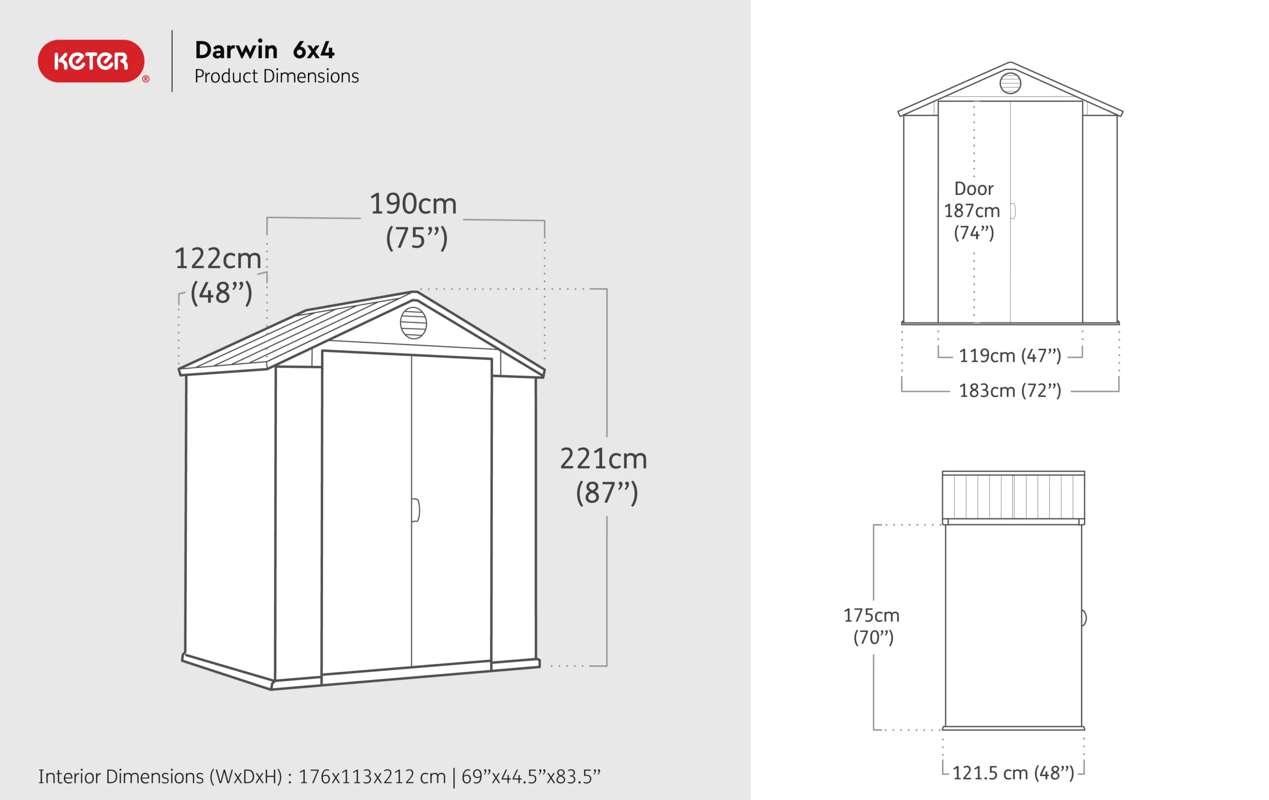 - Assembled external dimensions: 190 x 122 x 221 cm (L x W x H); internal dimensions: 176 x 113 x 212cm (L x W x H)