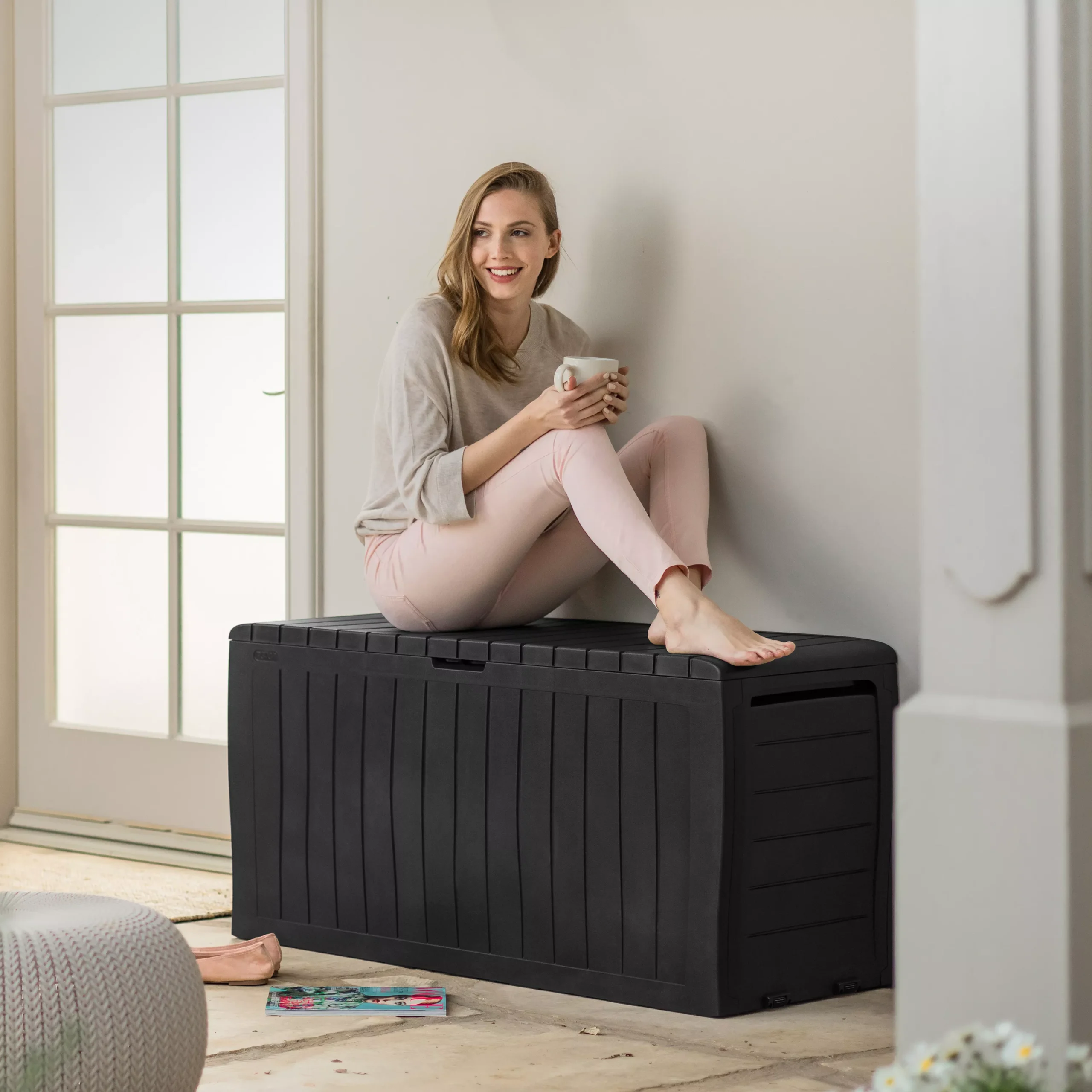- Ideal outdoor storage box for garden tools and equipment, furniture cushions, garden games and accessories